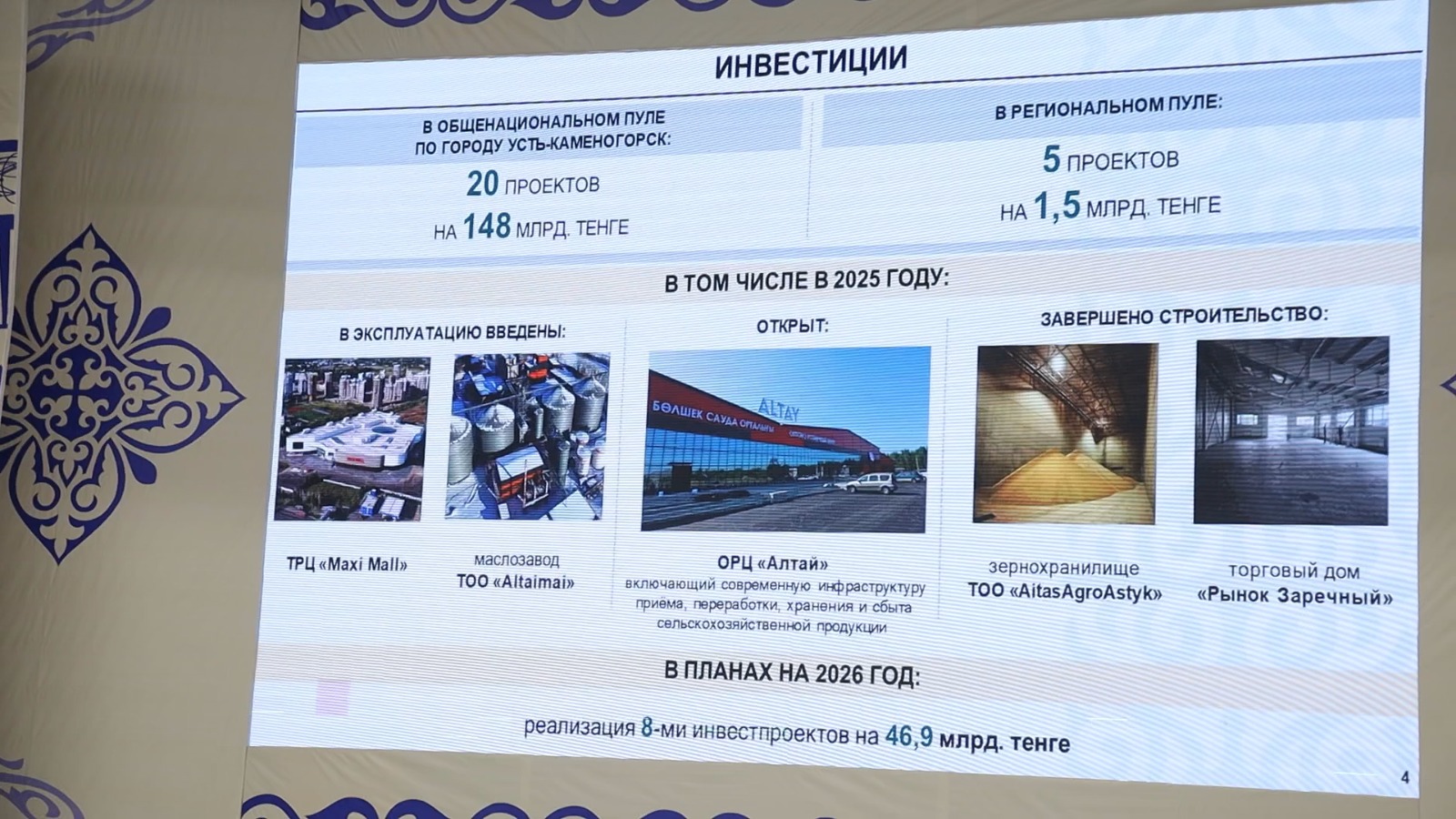 Есеп беру барысында қала әкімі Өскемен қаласының әлеуметтік-экономикалық дамуы, инфрақұрылымды жаңғырту, тұрғын үй-коммуналдық шаруашылық, жол жөндеу және абаттандыру бағыттарында атқарылған жұмыстар туралы баяндама жасады. Сонымен қатар алдағы кезеңге жоспарланған негізгі жобалар мен басым міндеттерге тоқталды.