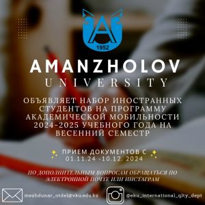 ВКУ им. С. Аманжолова объявляет набор иностранных студентов на программу академической мобильности 2024-2025 учебного года на весенний семестр. Сроки обучения: 15.01.2025-01.06.2025. Прием документов осуществляется с 1.11.2024 по 10.12.2024 года.