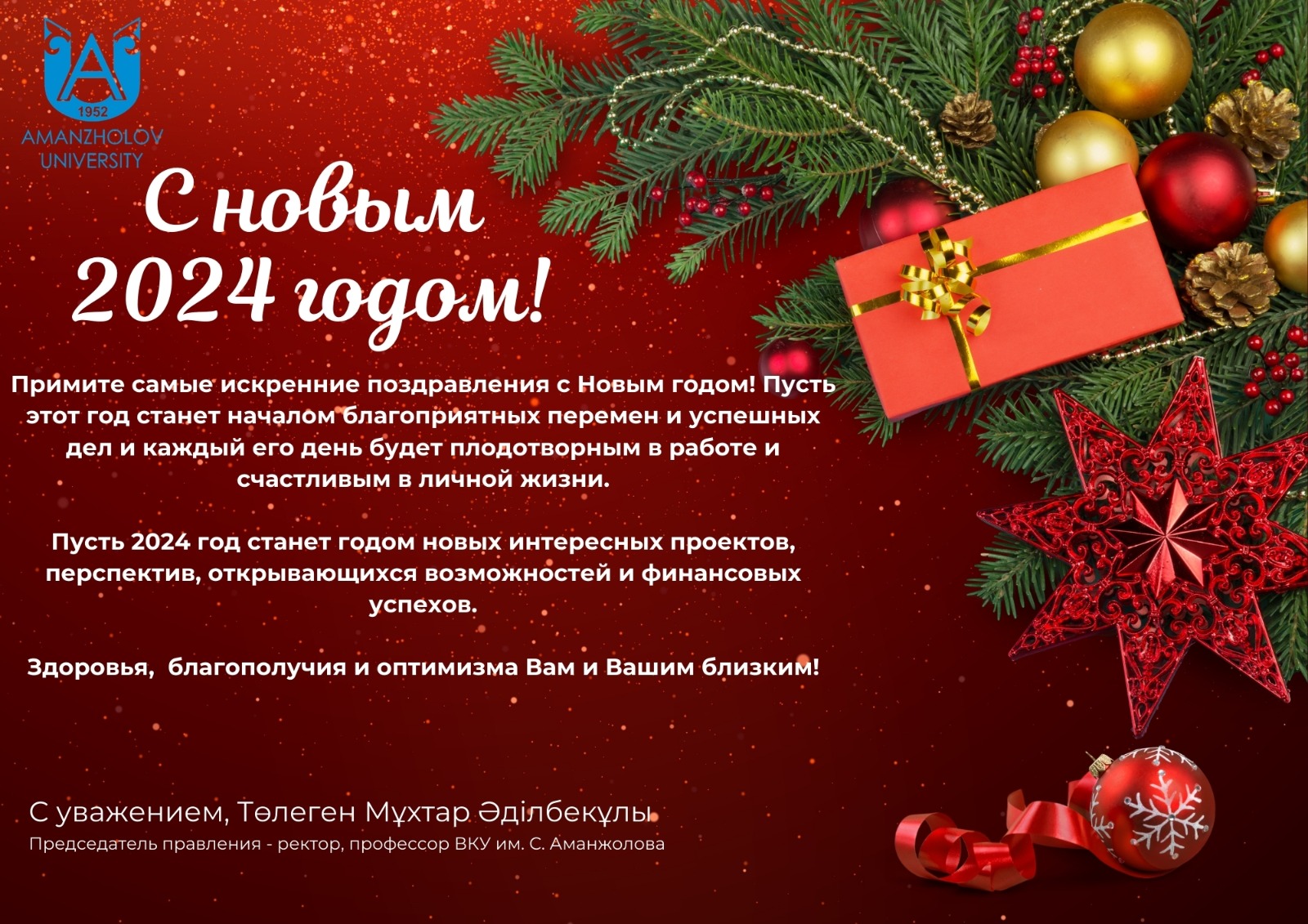Өтіп бара жатқан 2023 жылды қорытындылай келе С.Аманжолов атындағы ШҚУ-дың әрбір қызметкеріне, студентерге және түлектерге білім ордамыздың дамуына қосқан үлесі үшін алғыс айтамын. Сіздердің арқаларыңызда ШҚУ 70 жыл бойы Шығыс Қазақстанның іргелі білім беру және ғылыми орталығы атанып келеді. Оқу ордамыз облыста ғана емес, республикада да беделді, абыройлы.