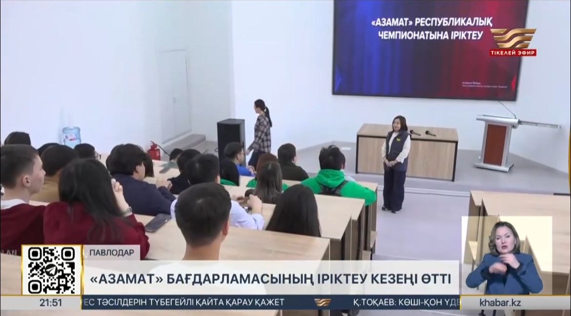 Региональный отборочный этап второго сезона республиканской интеллектуальной теледебатной программы «Азамат» прошёл в городе Павлодар на базе Павлодарского педагогического университета имени Алькея Маргулана. В мероприятии приняли участие и студенты Университета Аманжолова, достойно представившие честь своего вуза. В частности, в региональном отборе проекта приняли участие Жигер Сарсенбаев и Мерхат Алмасулы, которые продемонстрировали высокий уровень знаний и ораторского мастерства, активно проявив себя в ходе дебатов.