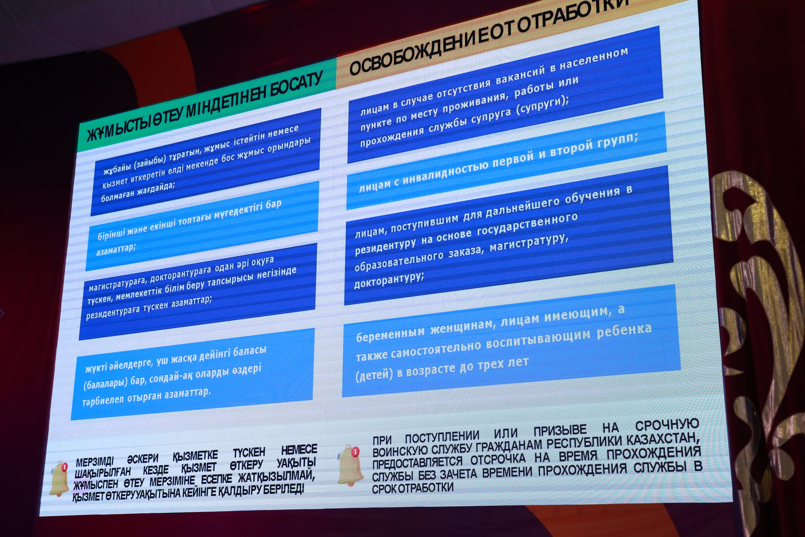 Оның айтуынша педагогикалық, техникалық, ауылшаруашылық мамандықтары бойынша грант иегерлері білім грантын 3 жыл өтеуге міндетті. «Серпін» бағдарламасының грант иегерлері 2 жыл өз мамандықтары бойынша 7 өңірде жұмыс істеуге тиесілі. Ал ауыл квотасымен білім алған студент ауыл мекемелерінде 3 жыл жұмыс істеп грантын өтеуге міндеттеледі. Сонымен қатар жұмысты өтеу міндетінен босатылу санаттары, Egov электронды үкімет порталын қолдану аясының артықшылықтарын түсіндірді.