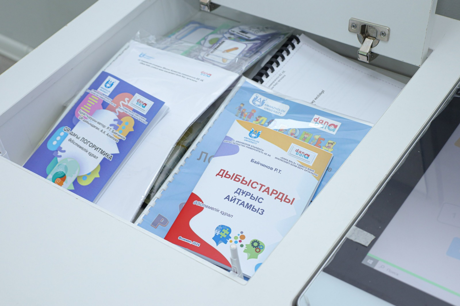 Үстел интерактивті және практикалық әдістерді алмастырып отыруға мүмкіндік береді. Егер бала сенсорлық моноблокта үйренгісі келмесе, онда әдістемелік материалмен жұмыс істей алады. Айта кетейік, құрастырылған бұл үстел моделі — С. Аманжолов атындағы ШҚУ «Ерекше білім беру қажеттіліктері бар балаларды психологиялық-педагогикалық даярлау және әдістемелік-технологиялық қолдау жөніндегі құзыреттер орталығы» жобасының сәтті шыққан әзірлемелерінің бірі.