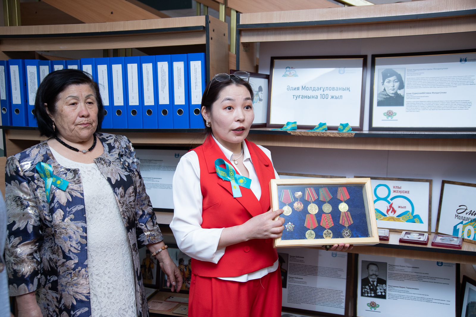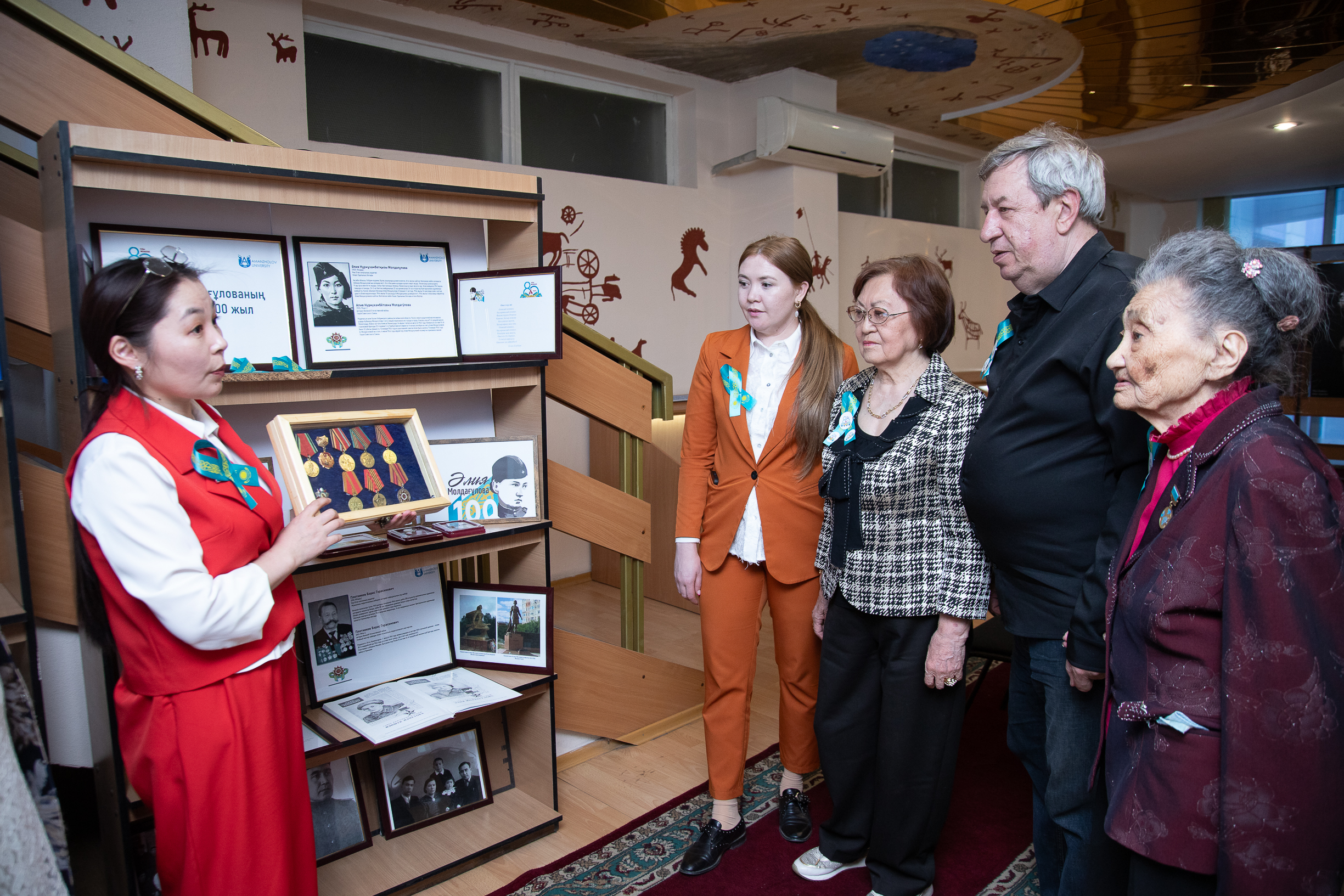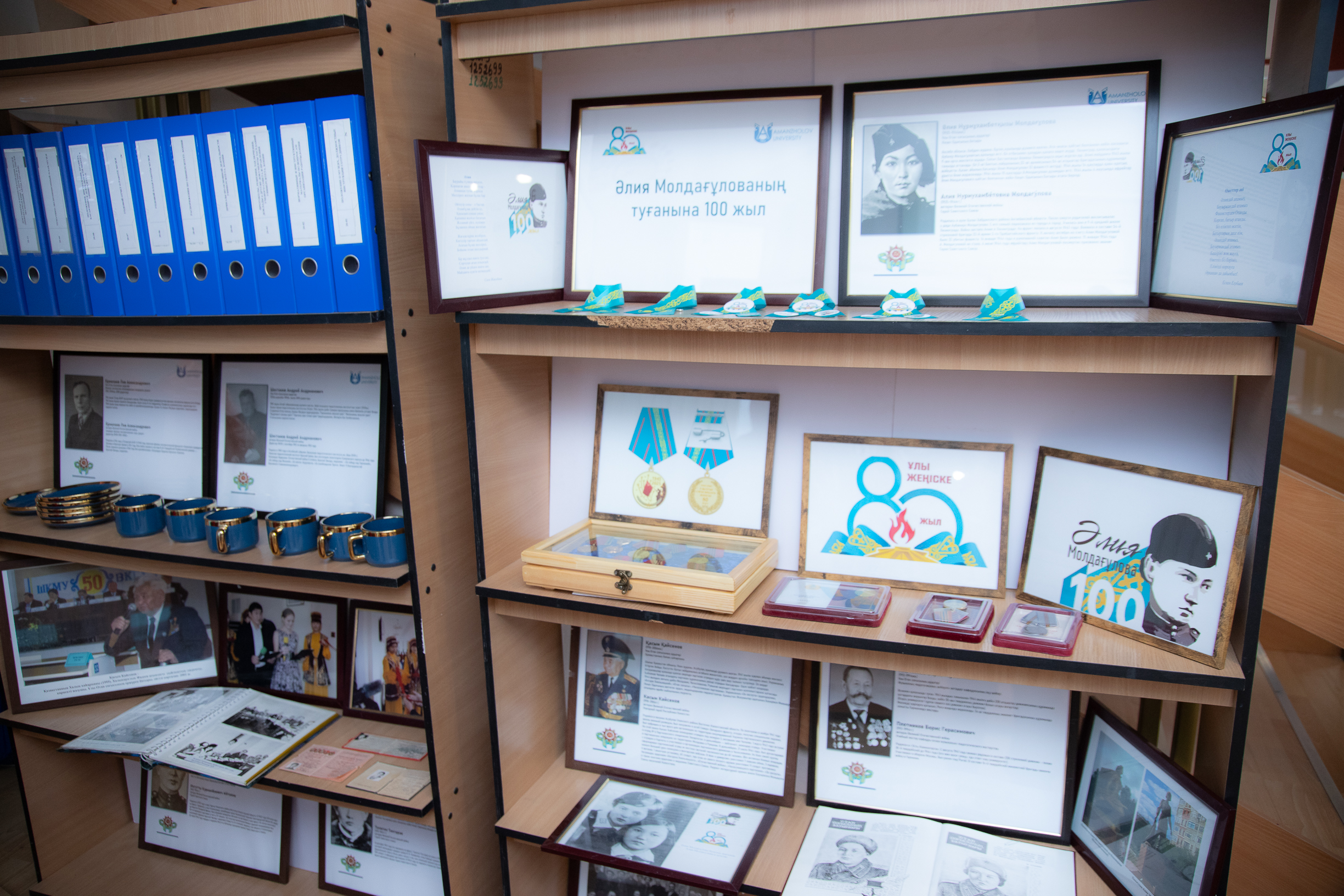 Veterans, students, teachers and guests of the university honored the memory of the heroes of the Great Patriotic War. The central part of the event was the exhibition, which presented jubilee medals of the participants of the war and home front, as well as the exposition dedicated to the university teachers – veterans of the Second World War: Ualieva Y. K., Amanzholova S. A., Shestakova A. A., Ermolaeva L. A., Plotnikova B. G., Golovanova F. G., Pakina L. A., and Hero of the Soviet Union Aliya Moldagulova.