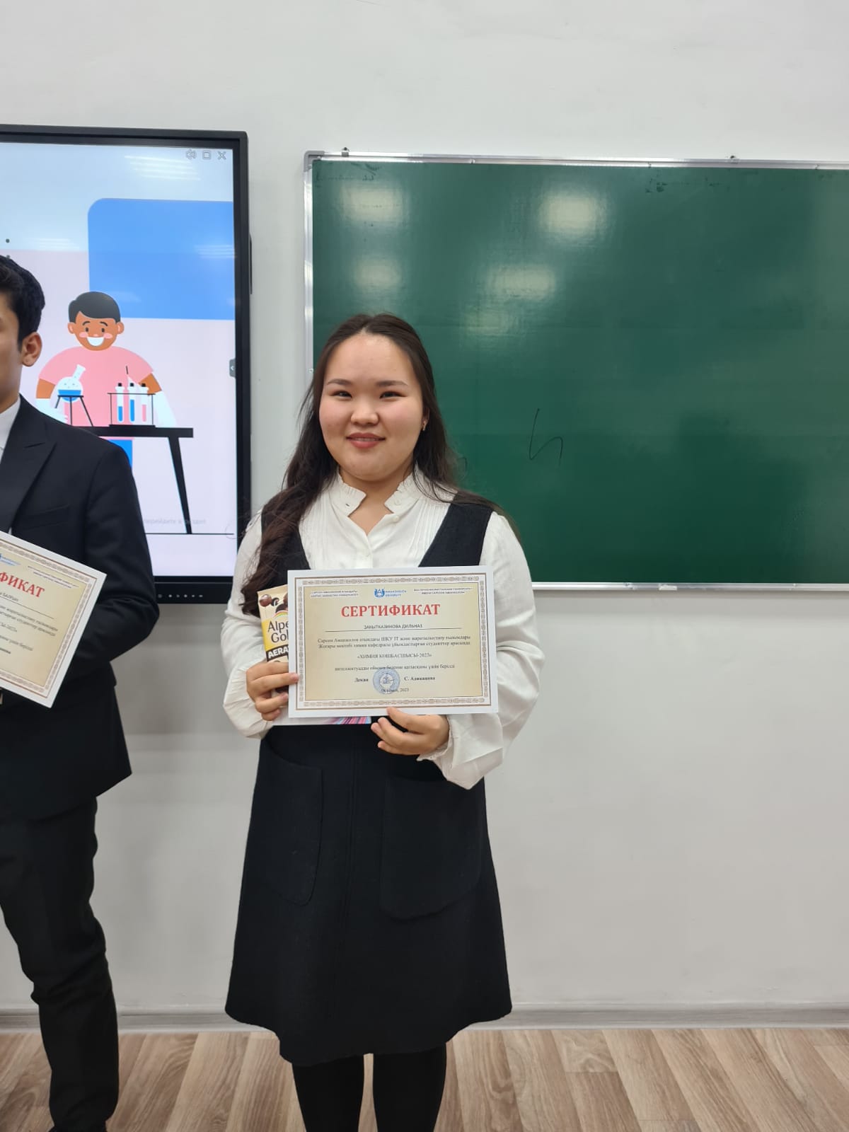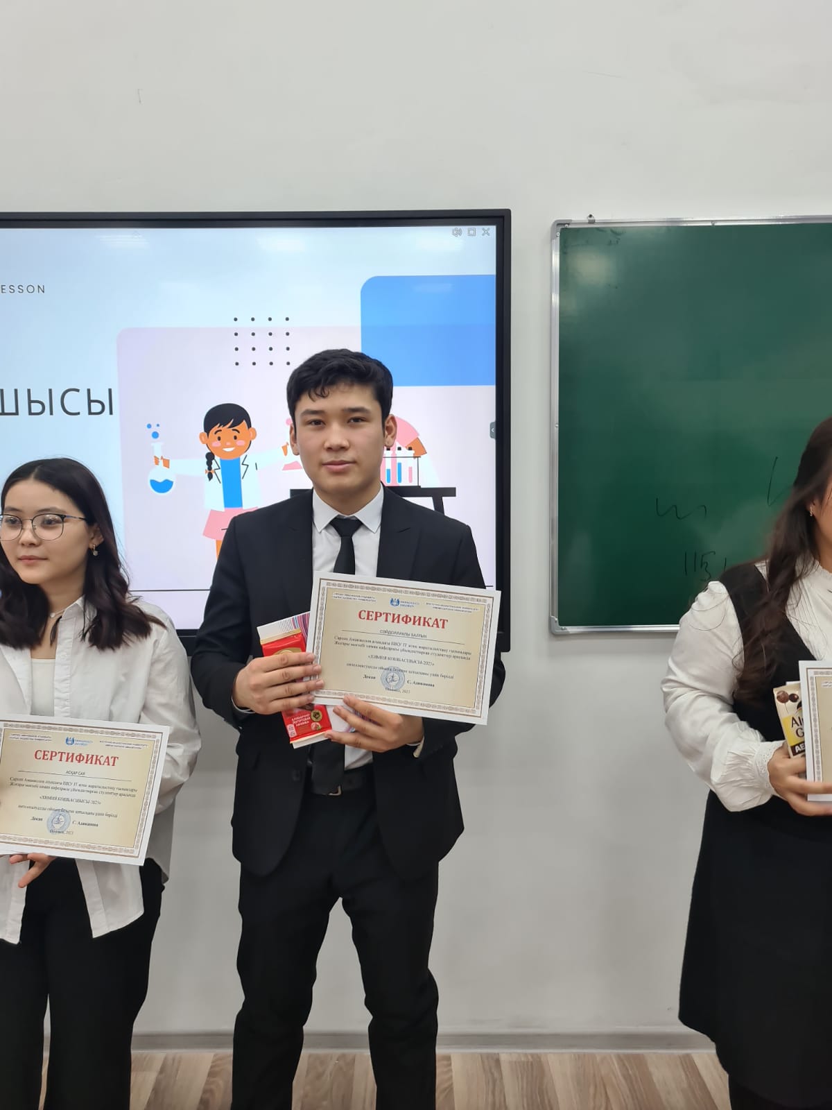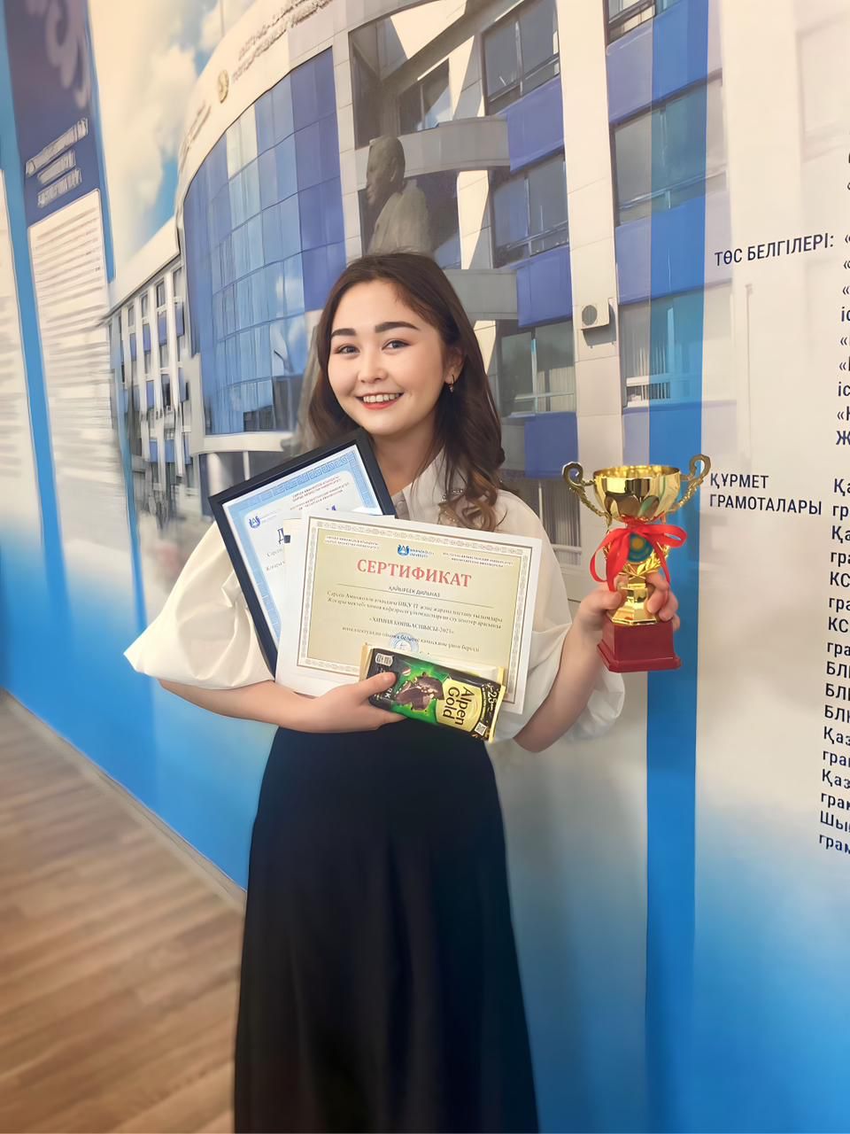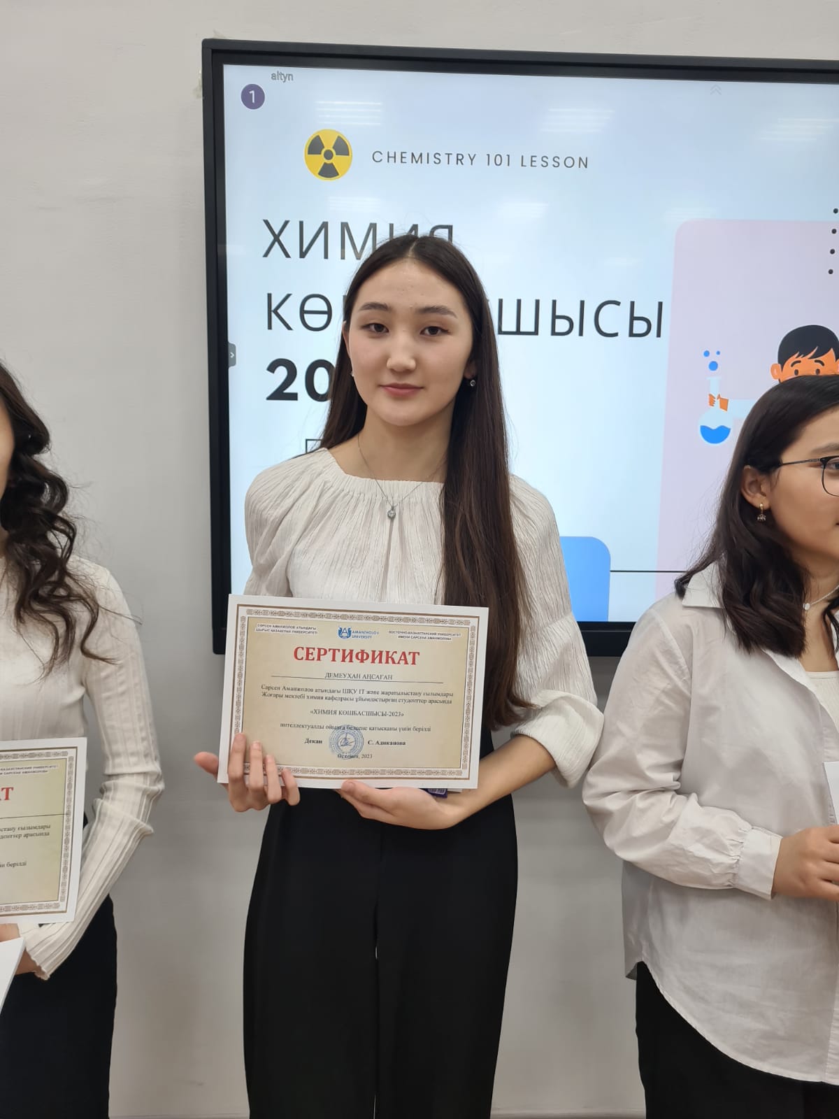 The winner of the game was the student of Chemistry Department Dilnaz Kairbek, who distinguished herself by her dexterity and cleverness. The girl won a gold cup and a diploma. The participants were given certificates and memorable gifts.