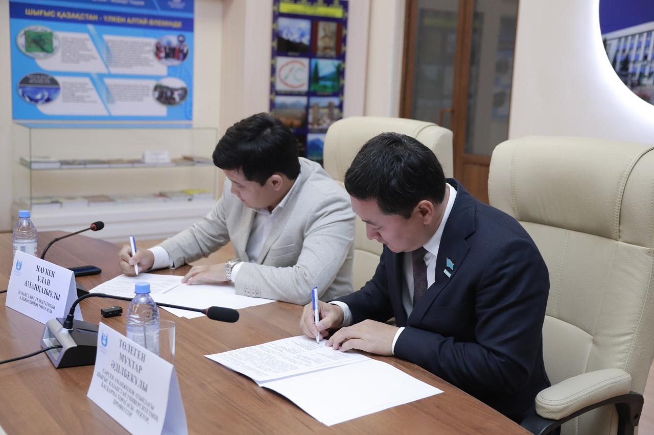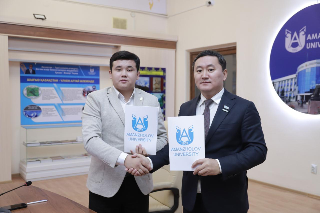 An important event took place at Sarsen Amanzholov East Kazakhstan University. The Rector of the university, Professor Mukhtar Tolegen, and the Chairman of the Alliance of Students of Kazakhstan, Ulan Nauken, signed a bilateral memorandum. The event was attended by university students.