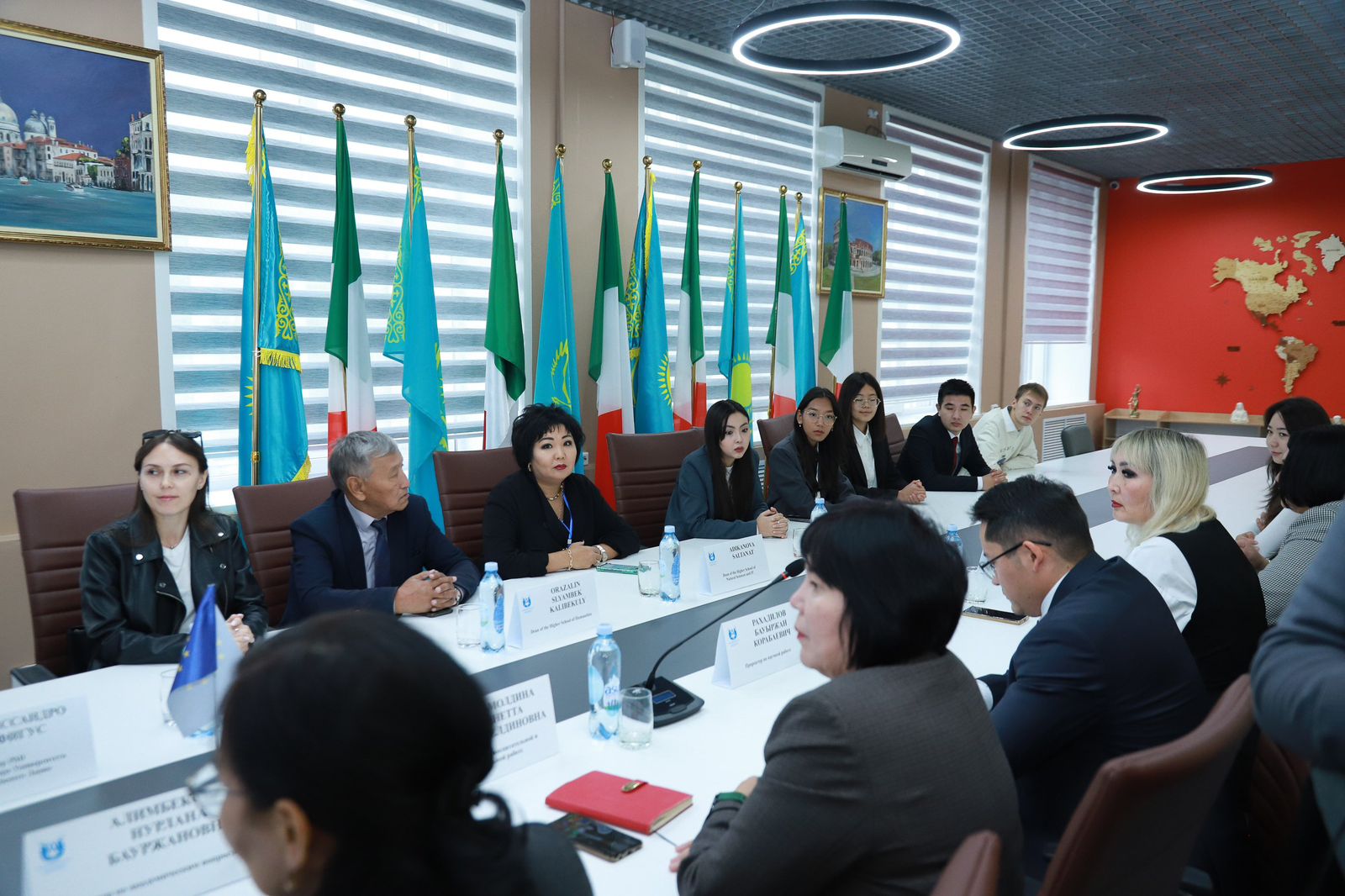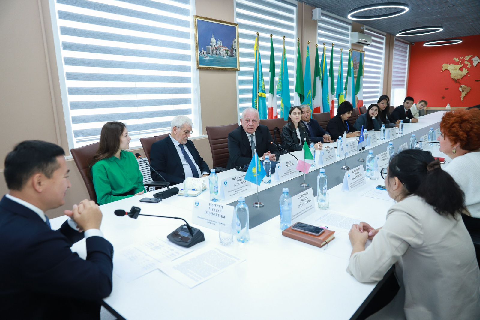 In the walls of the Salvatore Quasimodo Italian Cultural and Language Centre held a meeting of the Chairman of the Board-Rector, Professor M.A. Tolegen with Professor Guido Amoretti of the University of Genoa and permanent partner, Advisor to the Rector on internationalisation, Professor Alessandro Figus of the University of Cassino and Southern Lazio. The meeting took place in a friendly atmosphere with the participation of vice-rectors, deans of higher schools and students leaving for Italy in early October under the academic mobility programme.
