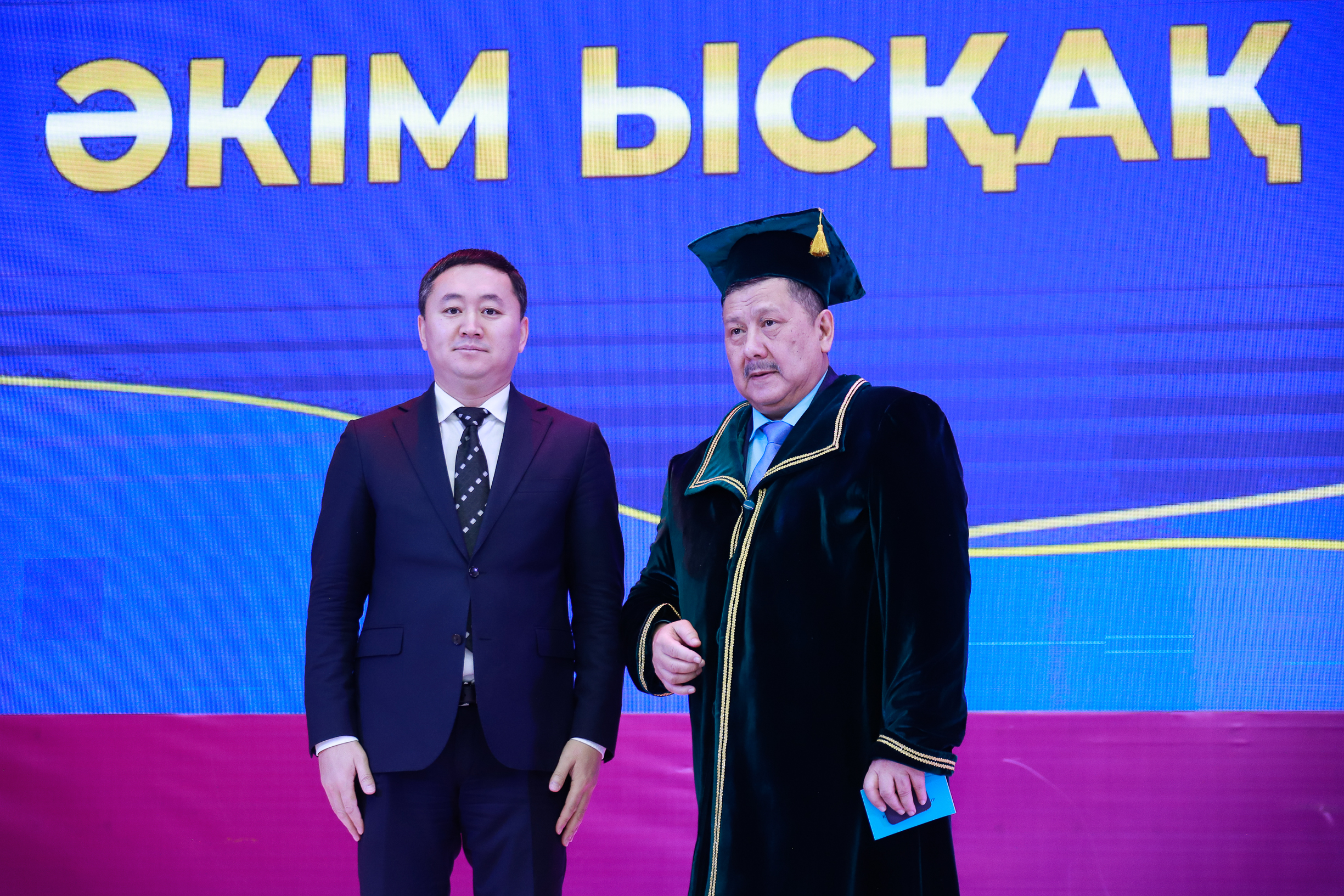 The evening concluded with a touching ritual conducted according to Kazakh tradition. As a sign of pure intentions, deep respect, and generosity of spirit, on behalf of the university rector Mukhtar Adilbekovich, a sacred shapan was draped over Akim Abdikhaymuly’s shoulders. This gesture became a symbol of recognition and gratitude for his contribution to the spiritual and cultural development of society.